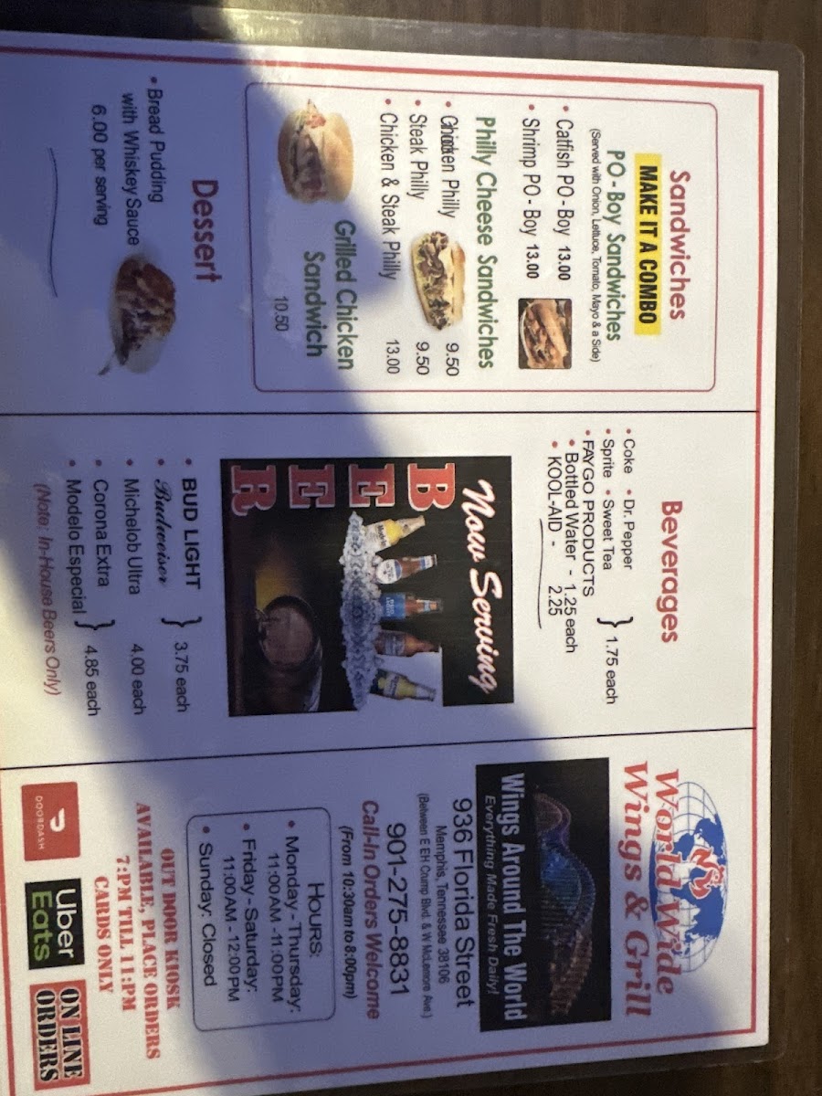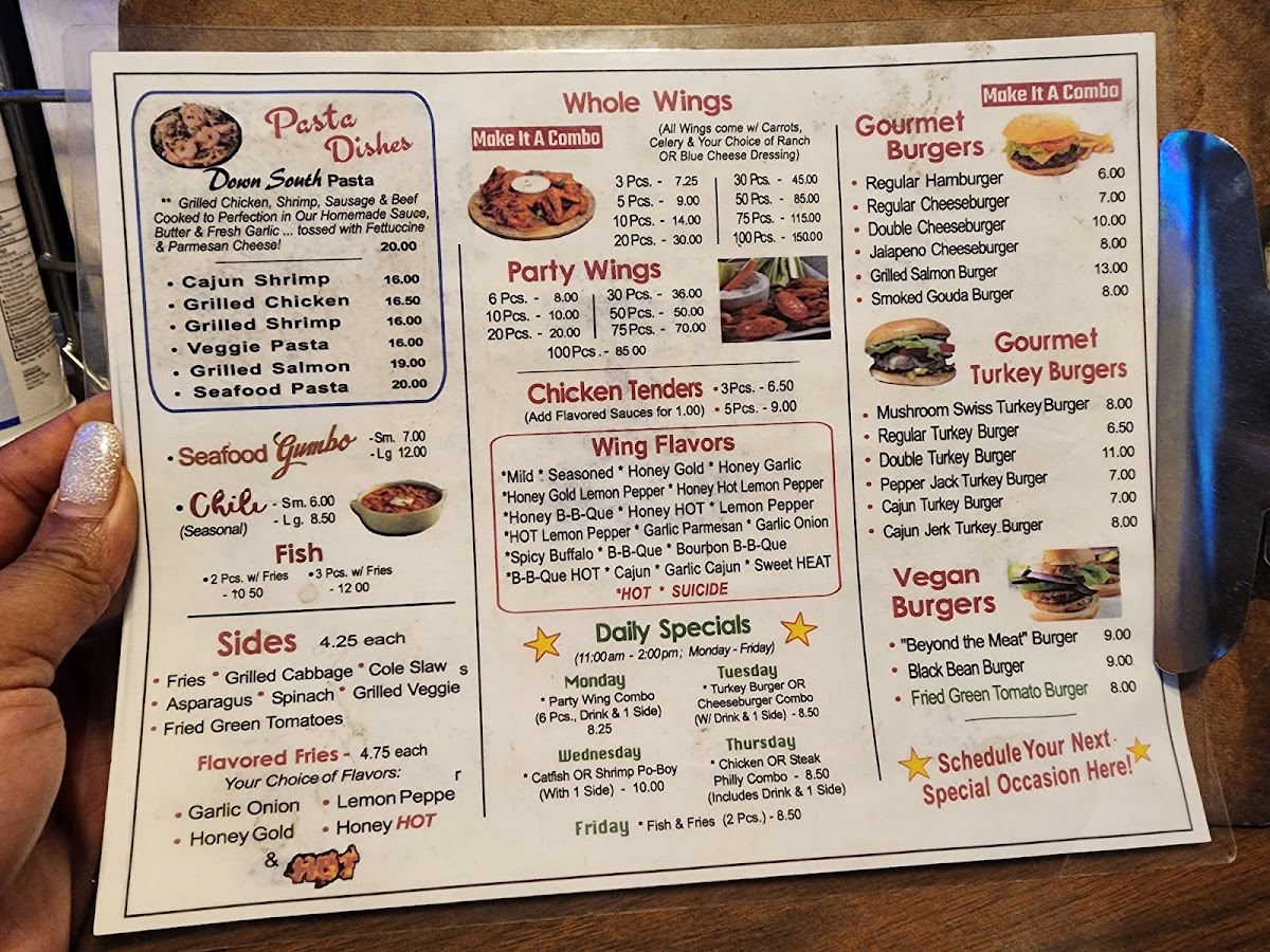 Welcome to Down South Wings & Grill, where every bite promises a taste of home-style comfort and Southern hospitality! Nestled at 936 Florida St, Memphis, TN, we're here to serve you a feast of mouthwatering dishes, perfect for satisfying your cravings. Dive into our menu highlights featuring the irresistible Steak Philly, packed with savory goodness, or try the Chicken Philly, a flavorful twist on a classic. Our Party Wings and Whole Wings are a must for wing enthusiasts, while the Fish and Chicken Tenders offer crispy, golden perfection. For burger lovers, indulge in our Regular Turkey Burger, Mushroom Swiss, Cheeseburger, or Regular Hamburger—each one crafted with care. Here at Down South, our menu is crafted to keep you coming back for more. Join us for a delightful dining experience that captures the spirit of Southern comfort!